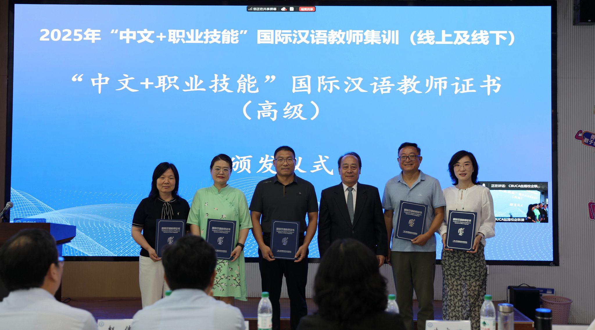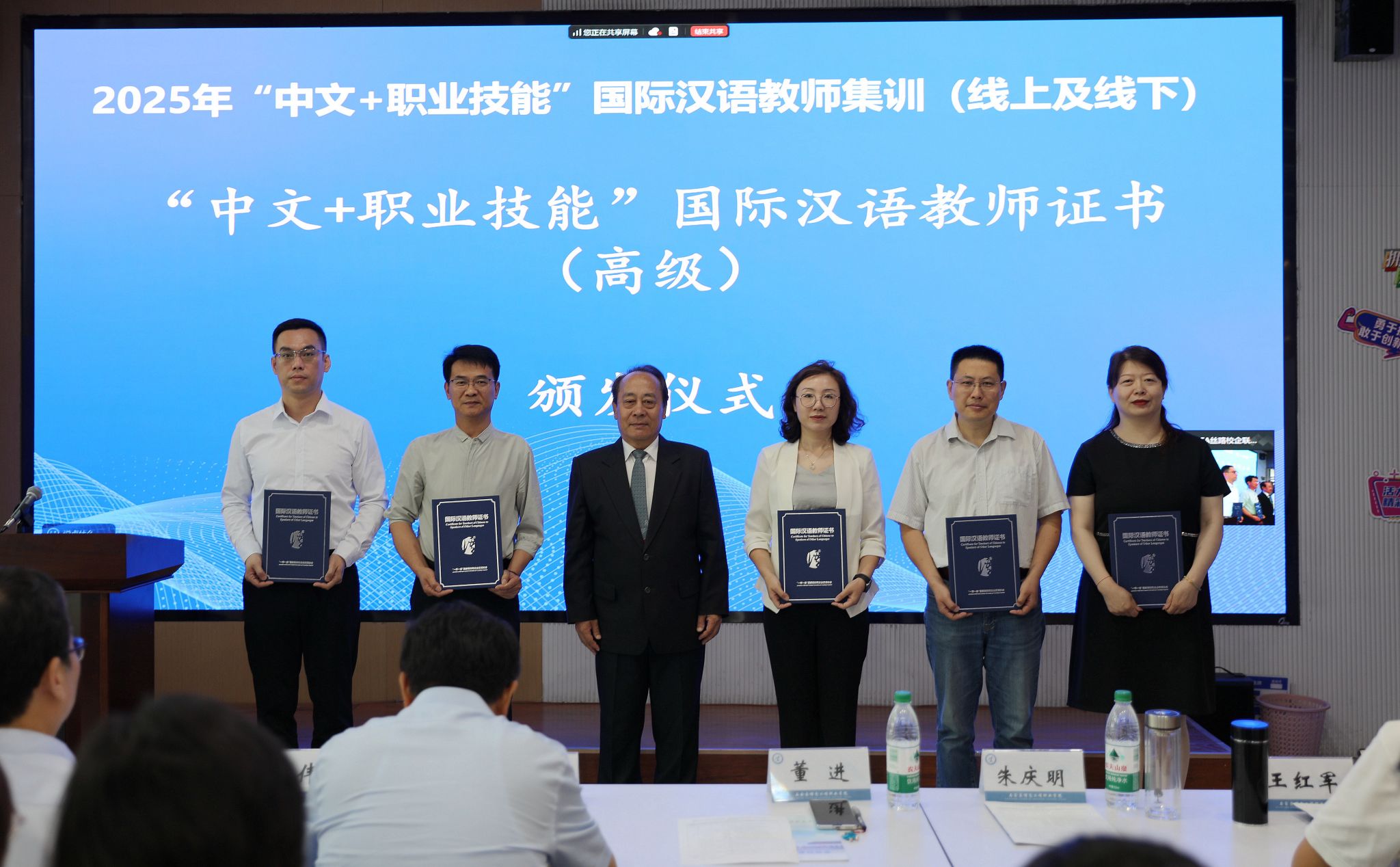 随后,许征程、赵伟、董进和朱庆明共同为基地揭牌。朱庆明教授向学院10位系部主任颁发国际汉语教师高级证书。江西旅游商贸职业学院、黄河水利职业技术大学等8所院校代表围绕国际化办学经验进行交流。