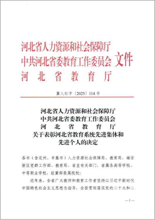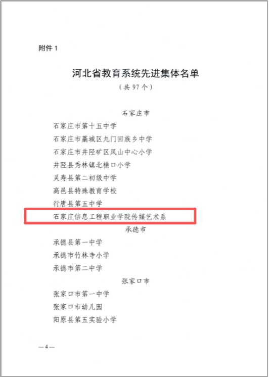 传媒报佳讯,喜报展风采。近日,由河北省人力资源和社会保障厅、中共河北省委教育工作委员会、河北省教育厅联合发文表彰,taptap点点传媒艺术系高质量党建、教育教学改革、人才培养、学科建设及社会服务等突出表现,荣获“河北省教育系统先进集体”称号。
