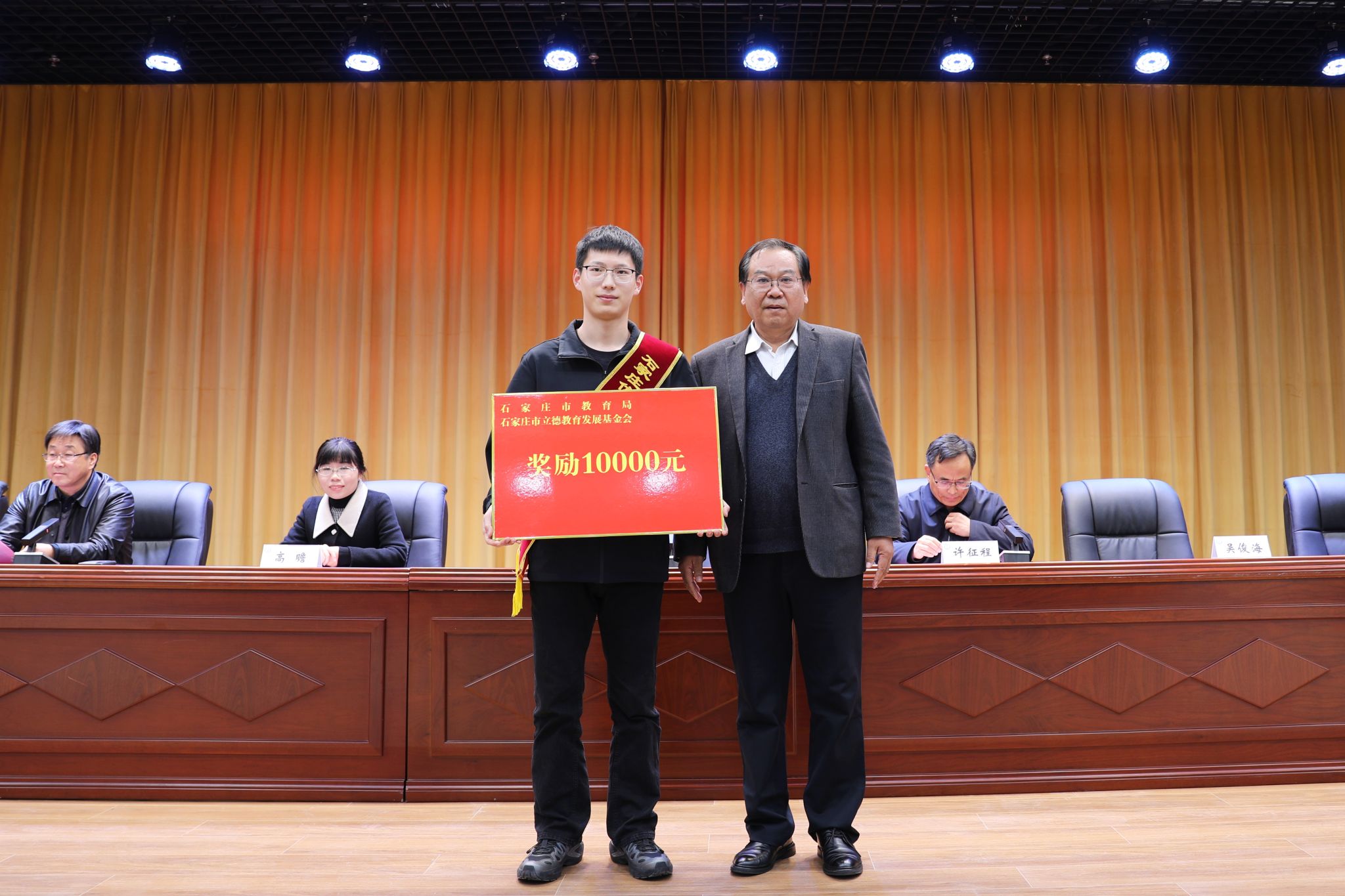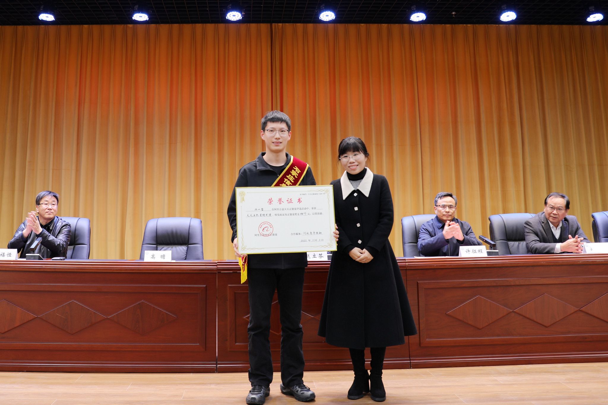 马福恒宣读《taptap点点体育关于授予顾一哲同学“信工好青年”荣誉称号的表彰决定》。决定授予顾一哲同学“信工好青年”荣誉称号并给予奖金奖励,授予辅导员王萌老师“育人楷模”荣誉称号并颁发奖品。同时,石家庄市立德教育发展基金会给予顾一哲同学奖金奖励,“阿里公益天天正能量”联合河北青年报社给予顾一哲同学奖金奖励。