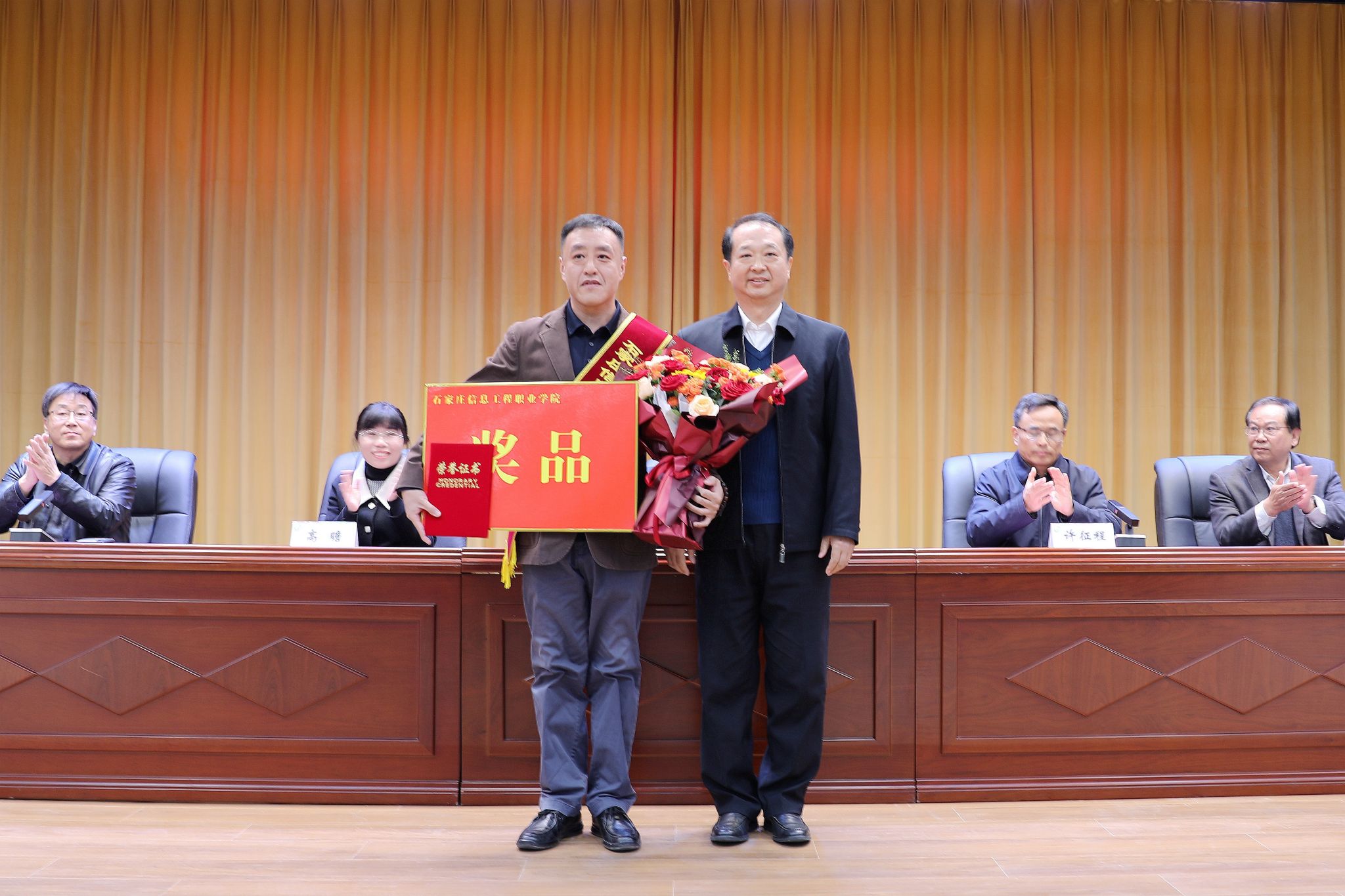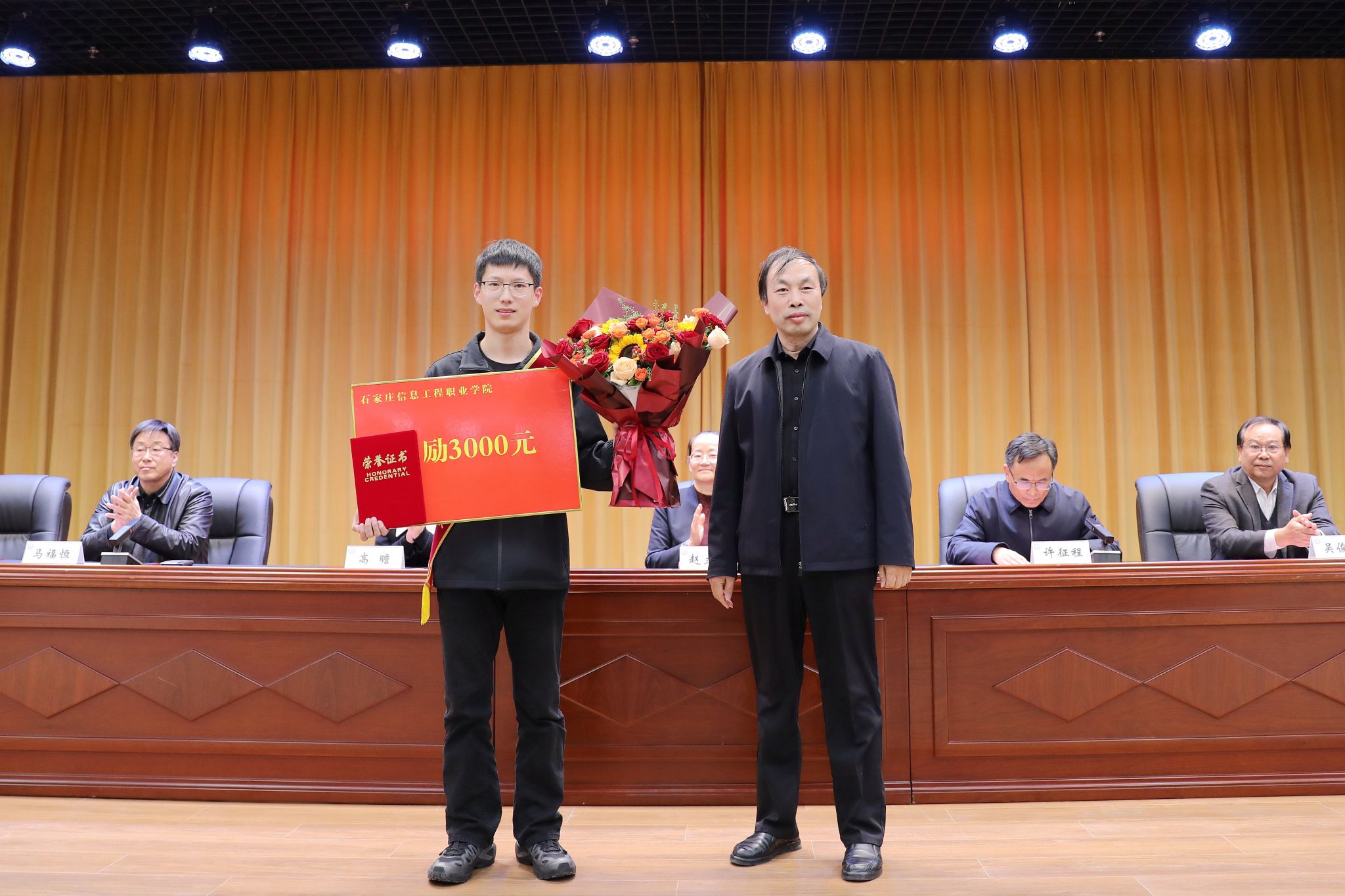 高瞻、吴俊海、刘占红为顾一哲同学颁发荣誉证书及奖金。王志明为辅导员王萌老师颁发“育人楷模”荣誉证书及奖品。范成宝向顾一哲同学的父母及哥哥献花,感谢家属的悉心培养与正向引导。