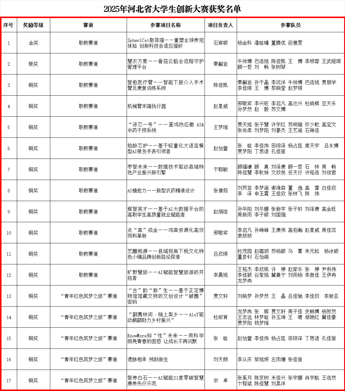 近日,河北省教育厅公布了2025年河北省大学生创新大赛获奖名单,taptap点点取得1项金奖、1项银奖、15项铜奖的优异成绩。此次成绩的取得充分展现了我校学子扎实过硬、勇于突破的创新实践能力。