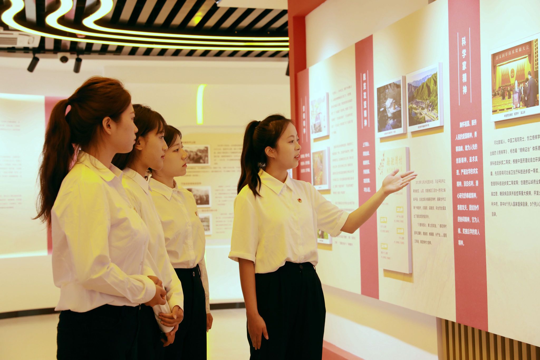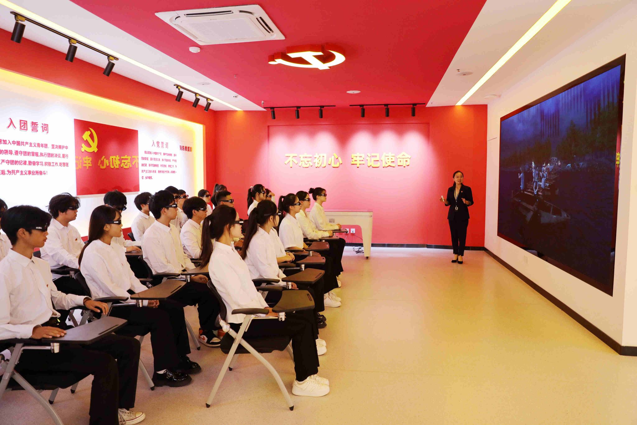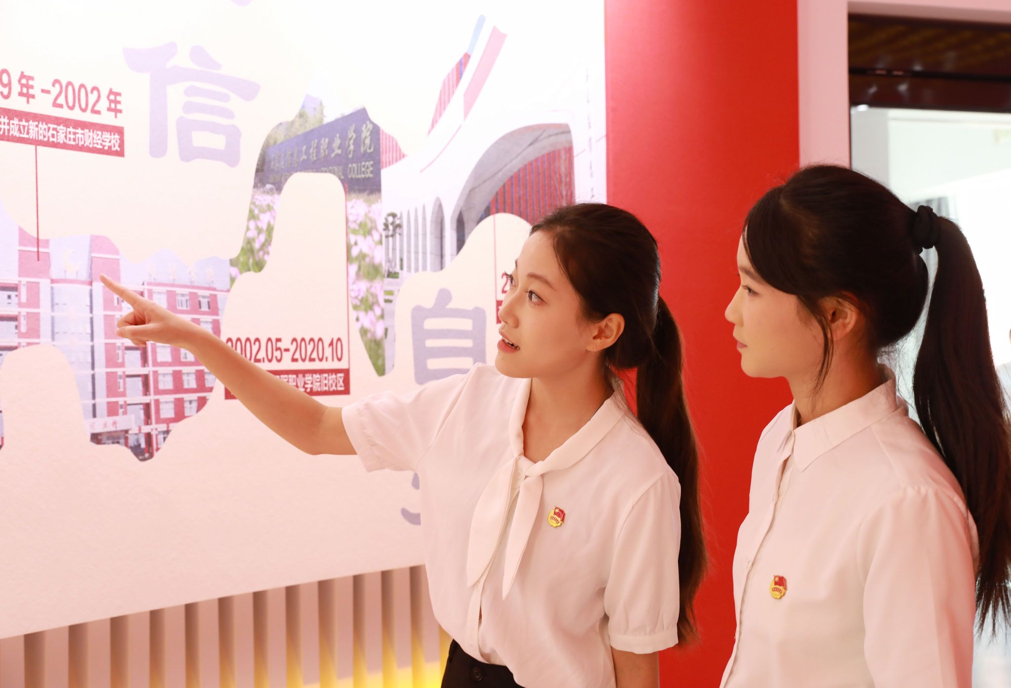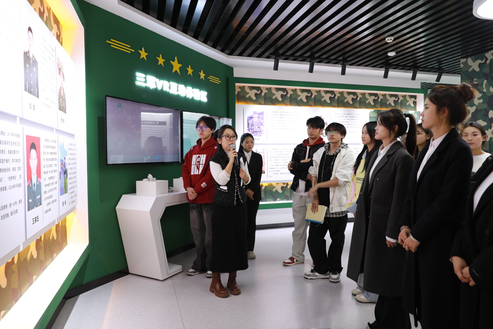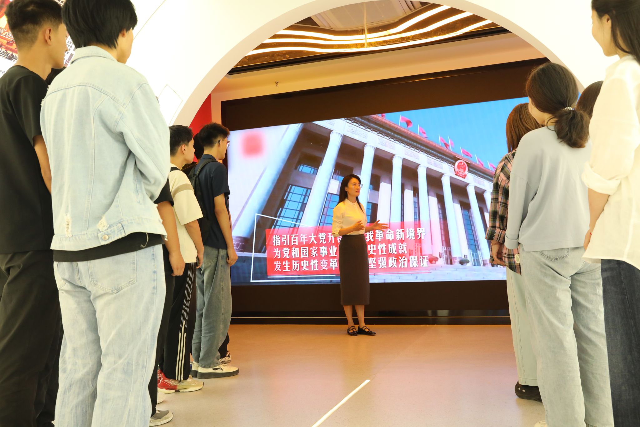 走进大思政教育实践中心,穿越“时光隧道”感受中国共产党百年波澜壮阔的奋进历程和新时代建设的伟大成就,感悟中国共产党人的初心使命,引导广大师生在回望峥嵘岁月中厚植家国情怀。这里全面展示学校党委发挥核心领导作用打造“一流党建”“智慧党建”的有力举措和标志性成果;深入挖掘燕赵大地蕴含的红色精神内涵,将红色基因与时代精神融入教学,努力开创“红色舞台剧”“我爱家乡红”等思政品牌,实现思政元素和教育场景的深度应用;生动融入河北省、石家庄积极践行党中央决策部署取得的一系列成就,使党的理论学习更加融会贯通,增强师生“四个自信”,保持政治“三力”,通过“地域实践+理论升华”,用地方发展生动实践精准诠释党的理论建设成果;融合应用课程思政建设数智化成果,依托数智思政教学平台,整合线上线下教学资源,全面赋能教学相长;高度契合学工管理创新发展需求,贴近学生学习生活,丰富“五育并举”思政内涵,为开展主题教育、强化学生管理与服务提供鲜活样本;用心营造润物无声的校园文化、企业文化,在文化熏陶中厚植爱校情怀、涵养职业素养;精准施策大学生心理健康教育,建立学生心理成长档案,分层分类开展个性化辅导,让思政教育的“精神引领”与心理教育的“情感关怀”同频共振。同时,还开辟了“党团员活动区”、“行为规范知识抢答区”“中华优秀传统文化体验区”“研讨交流区”等常态化教育培训专属空间。各版块协同联动,构建起“沉浸式体验——互动式学习——实践性感悟”的育人闭环,既强化思想引领,又贴合学生成长需求与职业发展导向,让立德树人更具针对性和吸引力,打造了思政教育的又一课堂。