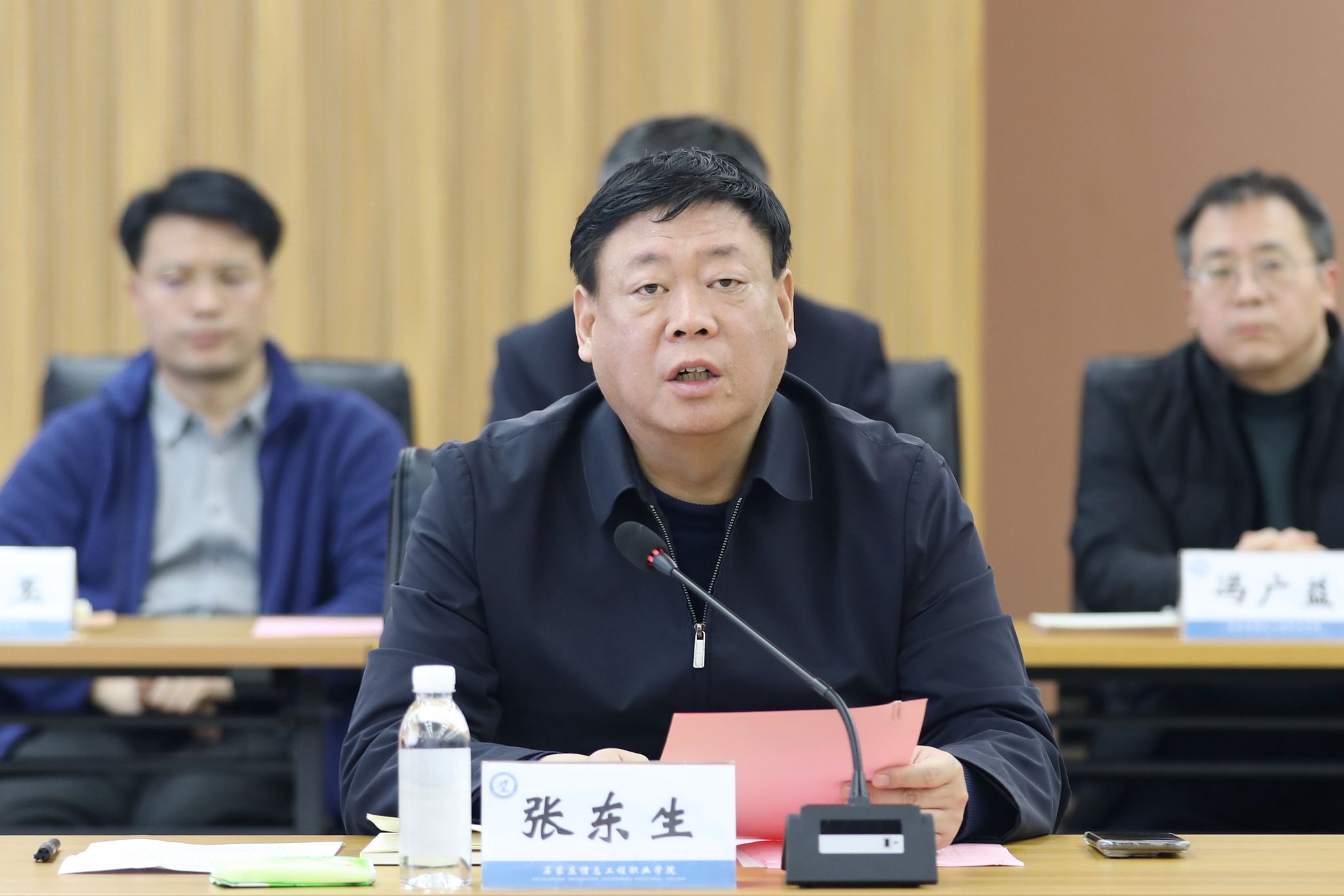 22日上午,专家组现场考察见面会在启智报告厅举行。河北省教育厅二级巡视员、职成教处处长张化平出席见面会并讲话。学院党委书记赵立芬致辞,院长许征程主持并作情况汇报。省教育厅职成教处副处长李辉及学院领导班子、全体中层干部参加。