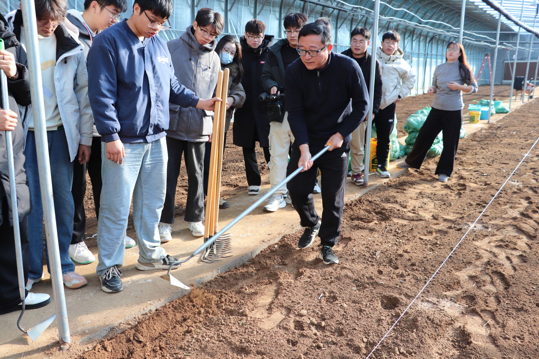 仪式后,农林牧医系党总支“小农人”智慧服务团队、党员先锋团队19人前往种植基地。在种植现场,团队成员们从分墒、开沟、播种、覆土到浇水,一步步详细讲解操作规则和注意事项。师生和农户在田间劳作,每一步都严格按照科学流程进行,彼此分工,相互协作。