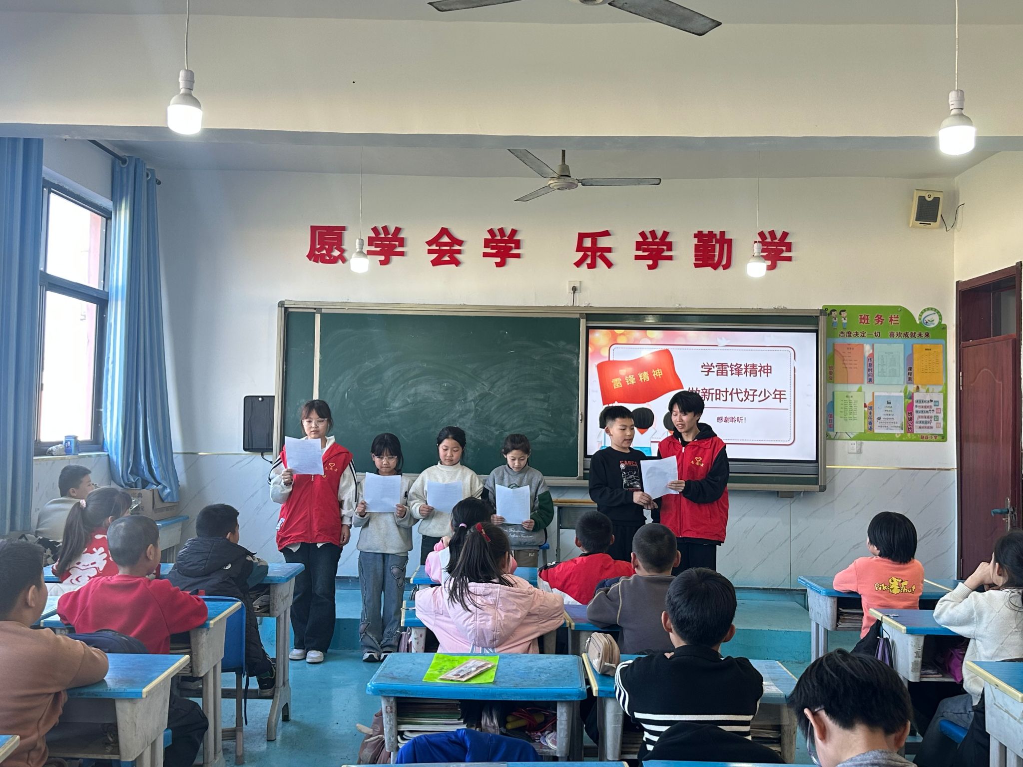 “学习雷锋好榜样,忠于革命忠于党,爱憎分明不忘本……”藁城区张家庄镇赵庄村小学三年级(1)班教室传出阵阵歌声,这里正在进行一场别开生面的“追锋”红色课堂。近日,网络与通信工程系宣讲小组的志愿者们用“青言青语”为同学们创新演绎雷锋精神,架起红色传承的桥梁。