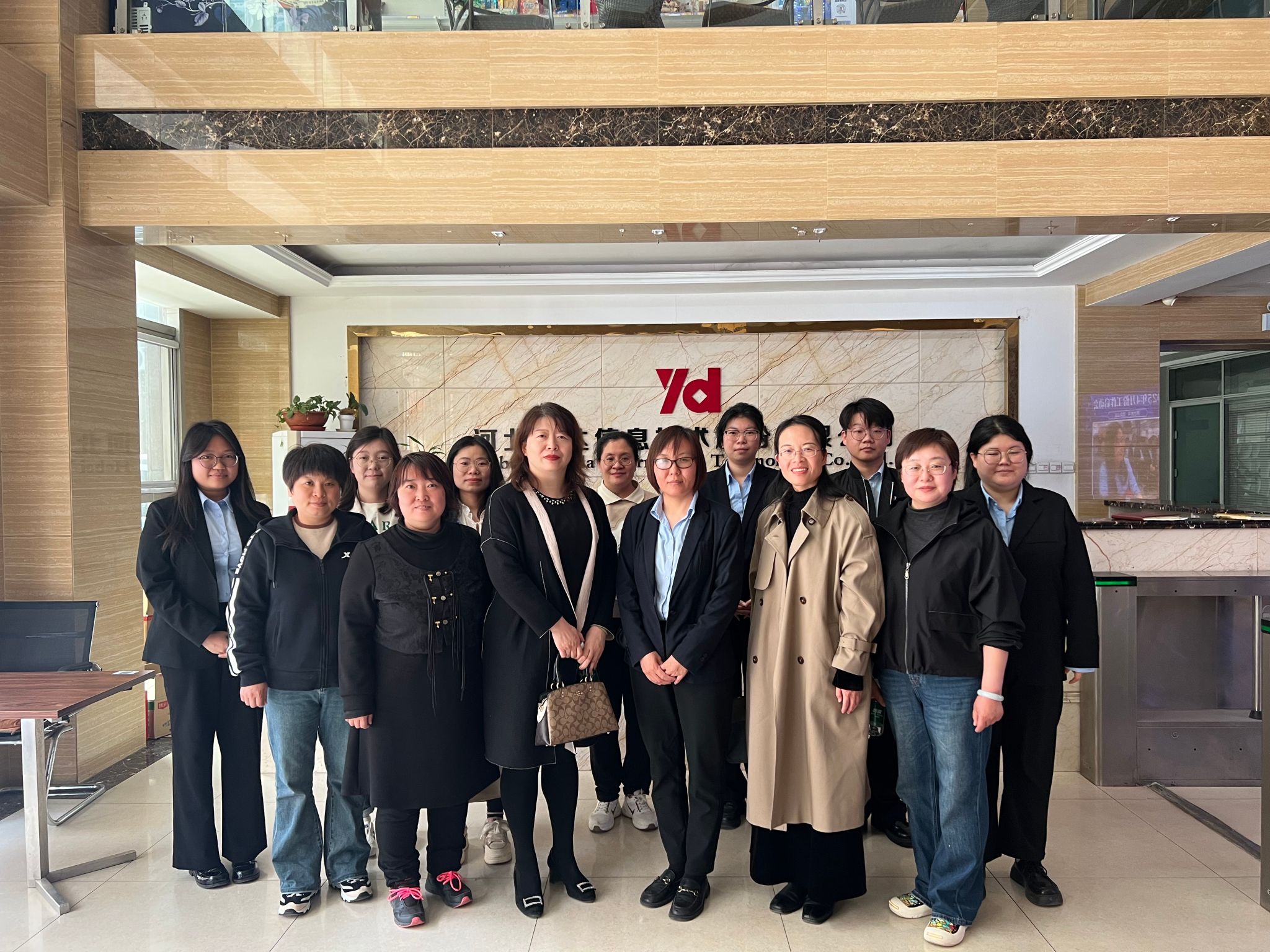 最后,校企双方领导、金融教研室教师及实习学生在企业前台合影留念,为此次走访活动画上了圆满的句号。
