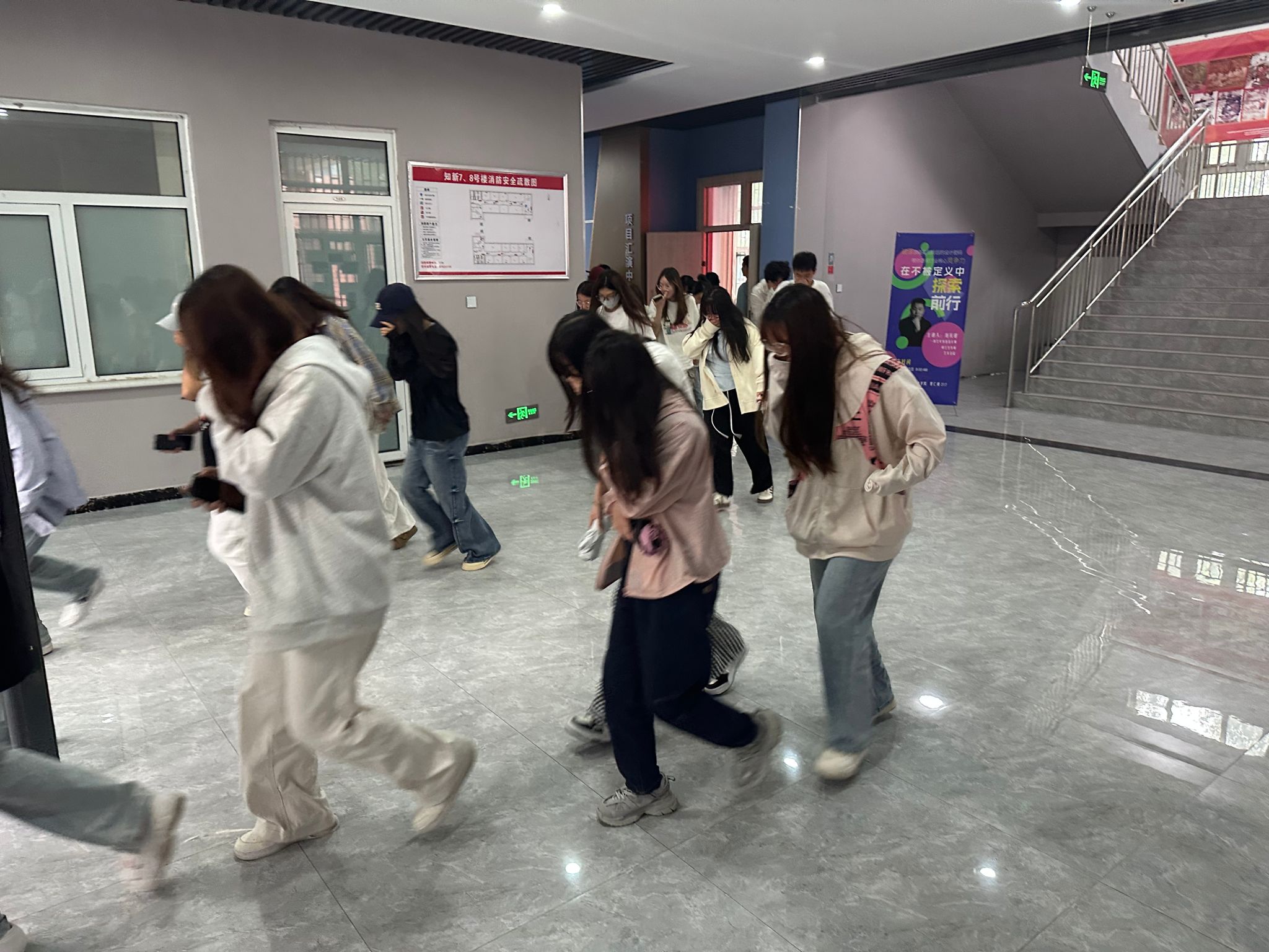 讲座结束后,梁靖东带领师生开展消防实战演练。随着警报声响起,模拟教学楼突发火情,学生们在辅导员的组织下,按照讲座所学,捂住口鼻、弯腰低姿,沿安全通道快速有序撤离至操场集合点。