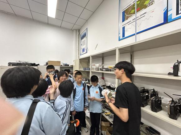 随后,学生们来到无人机社团活动场地,社团成员向来访学生展示了他们自主制作的无人机作品,并分享了在社团活动中的经历与收获。学生们围在社团成员身边,认真聆听他们讲述每一个作品背后的故事。