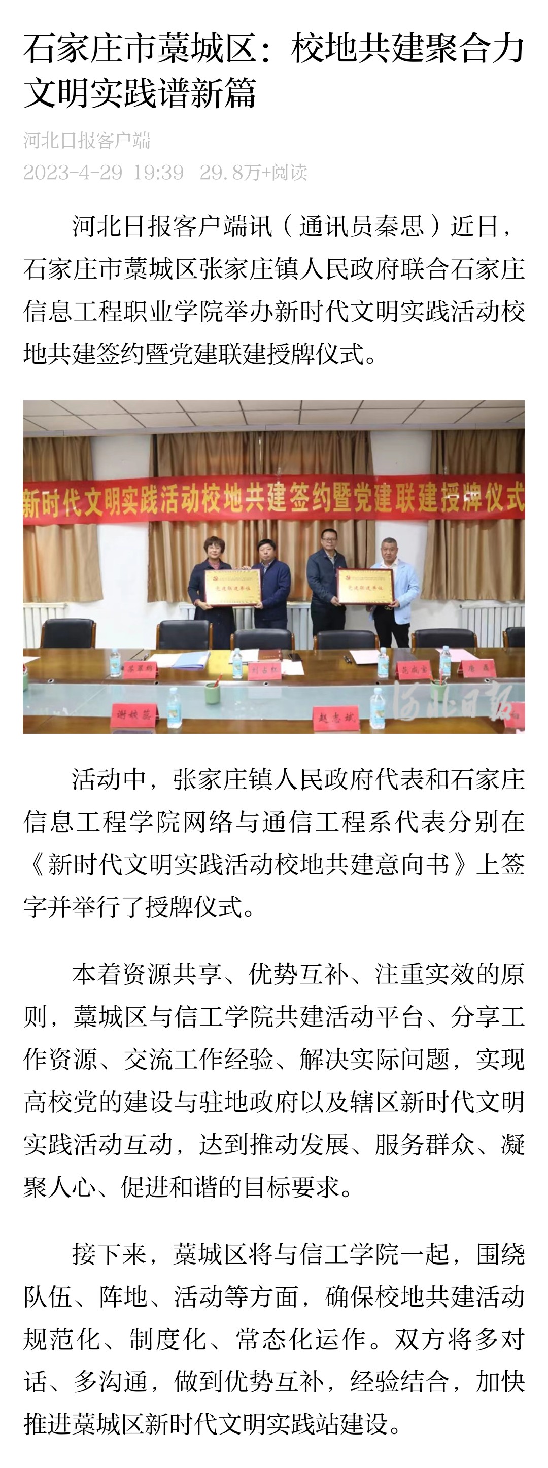 接下来,藁城区将与信工学院一起,围绕队伍、阵地、活动等方面,确保校地共建活动规范化、制度化、常态化运作。双方将多对话、多沟通,做到优势互补,经验结合,加快推进藁城区新时代文明实践站建设。