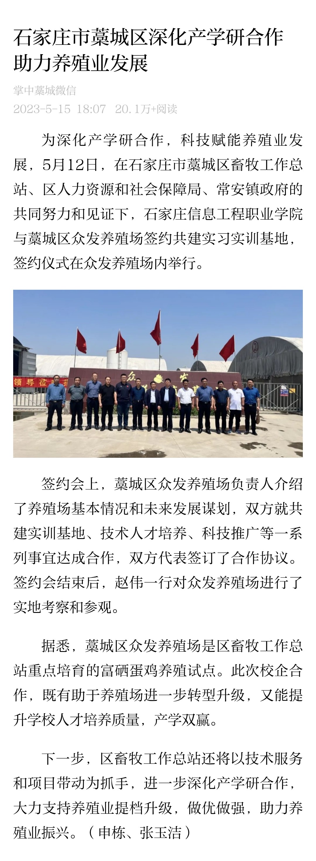 据悉,藁城区众发养殖场是区畜牧工作总站重点培育的富硒蛋鸡养殖试点。此次校企合作,既有助于养殖场进一步转型升级,又能提升学校人才培养质量,产学双赢。
