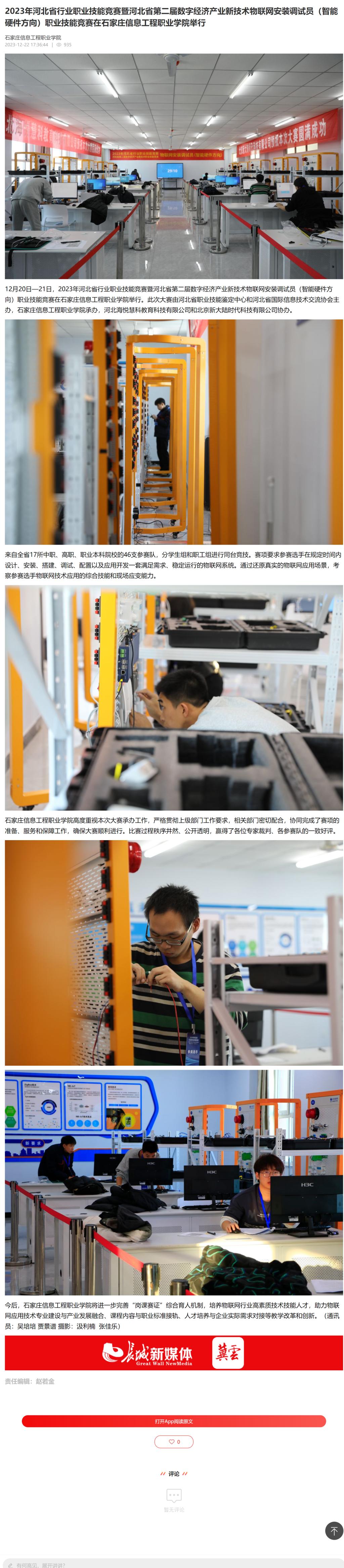 12月20日—21日,2023年河北省行业职业技能竞赛暨河北省第二届数字经济产业新技术物联网安装调试员(智能硬件方向)职业技能竞赛在taptap点点体育举行。此次大赛由河北省职业技能鉴定中心和河北省国际信息技术交流协会主办,taptap点点体育承办,河北海悦慧科教育科技有限公司和北京新大陆时代科技有限公司协办。