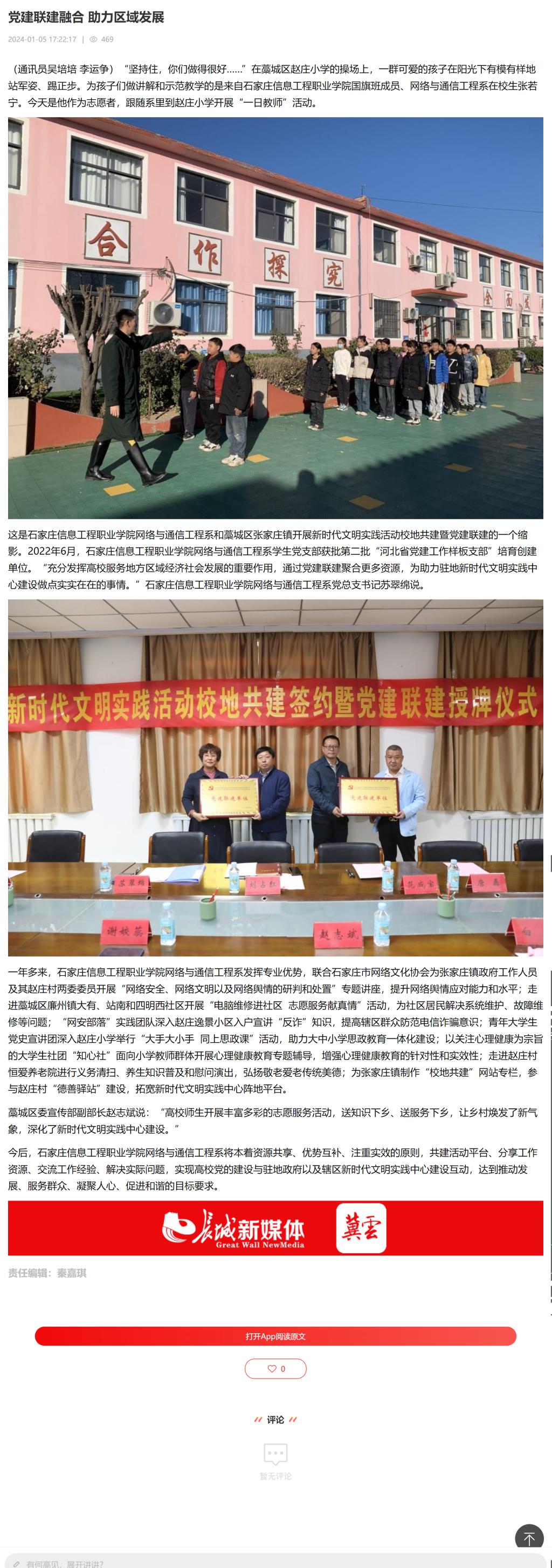 一年多来,taptap点点体育网络与通信工程系发挥专业优势,联合石家庄市网络文化协会为张家庄镇政府工作人员及其赵庄村两委委员开展“网络安全、网络文明以及网络舆情的研判和处置”专题讲座,提升网络舆情应对能力和水平;走进藁城区廉州镇大有、站南和四明西社区开展“电脑维修进社区 志愿服务献真情”活动,为社区居民解决系统维护、故障维修等问题;“网安部落”实践团队深入赵庄逸景小区入户宣讲“反诈”知识,提高辖区群众防范电信诈骗意识;青年大学生党史宣讲团深入赵庄小学举行“大手大小手 同上思政课”活动,助力大中小学思政教育一体化建设;以关注心理健康为宗旨的大学生社团“知心社”面向小学教师群体开展心理健康教育专题辅导,增强心理健康教育的针对性和实效性;走进赵庄村恒爱养老院进行义务清扫、养生知识普及和慰问演出,弘扬敬老爱老传统美德;为张家庄镇制作“校地共建”网站专栏,参与赵庄村“德善驿站”建设,拓宽新时代文明实践中心阵地平台。