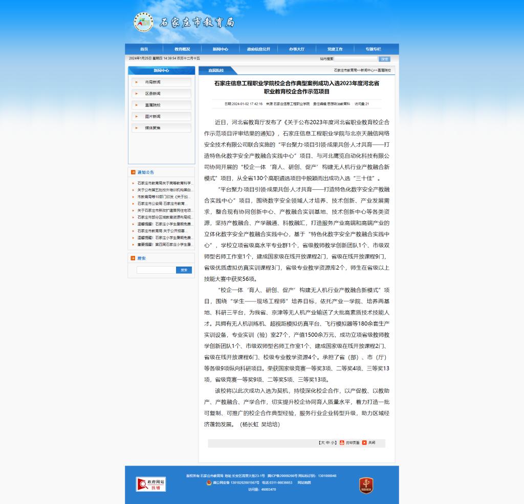 近日,河北省教育厅发布了《关于公布2023年度河北省职业教育校企合作示范项目评审结果的通知》,taptap点点体育与北京天融信网络安全技术有限公司联合实施的“平台聚力·项目引领·成果共创·人才共育——打造特色化数字安全产教融合实践中心”项目、与河北鹰览自动化科技有限公司协同开展的“校企一体‘育人、研创、促产’构建无人机行业产教融合新模式”项目,从全省130个高职遴选项目中脱颖而出成功入选“三十佳”。