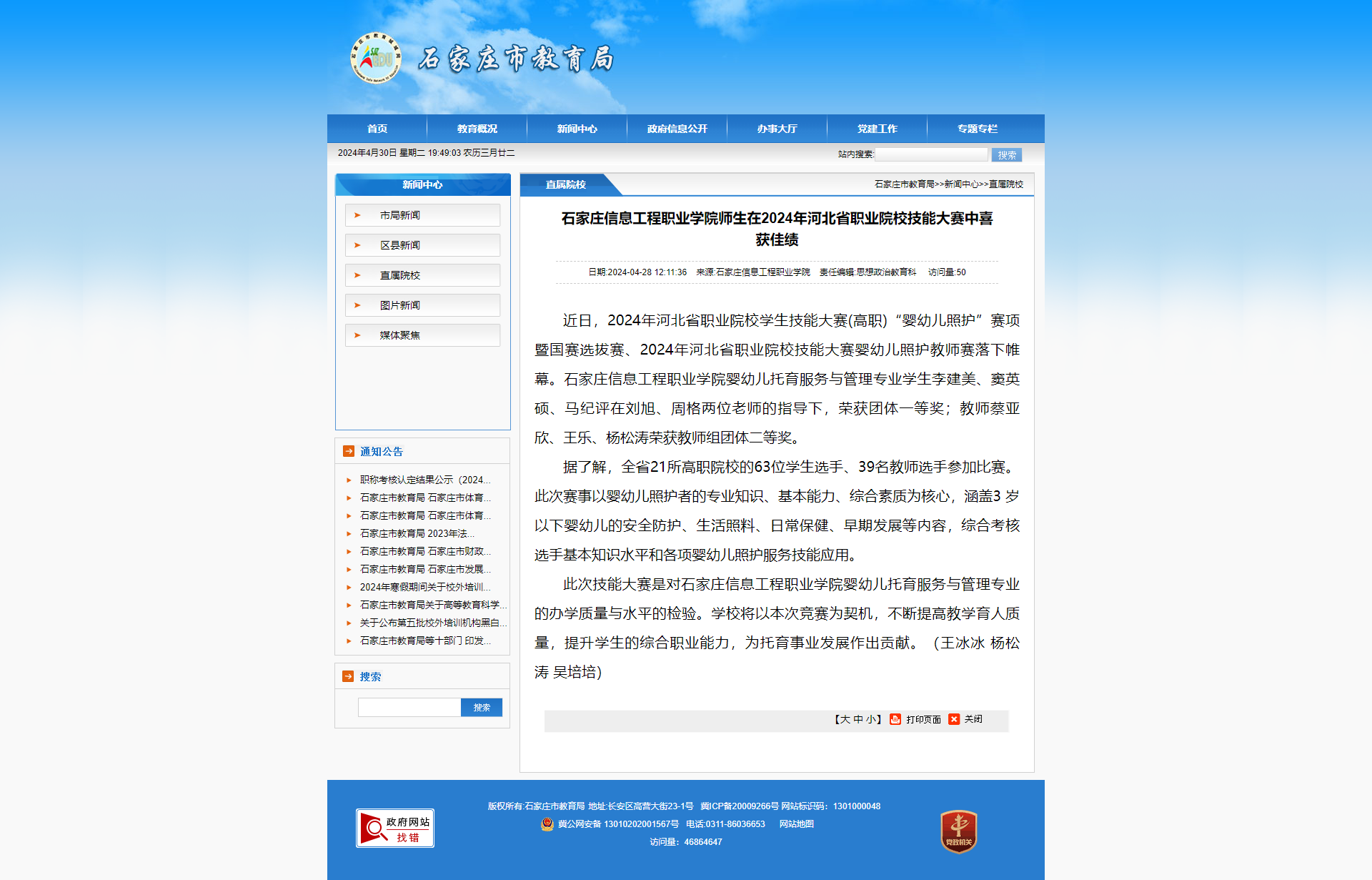 近日,2024年河北省职业院校学生技能大赛(高职)“婴幼儿照护”赛项暨国赛选拔赛、2024年河北省职业院校技能大赛婴幼儿照护教师赛落下帷幕。taptap点点体育婴幼儿托育服务与管理专业学生李建美、窦英硕、马纪评在刘旭、周格两位老师的指导下,荣获团体一等奖;教师蔡亚欣、王乐、杨松涛荣获教师组团体二等奖。