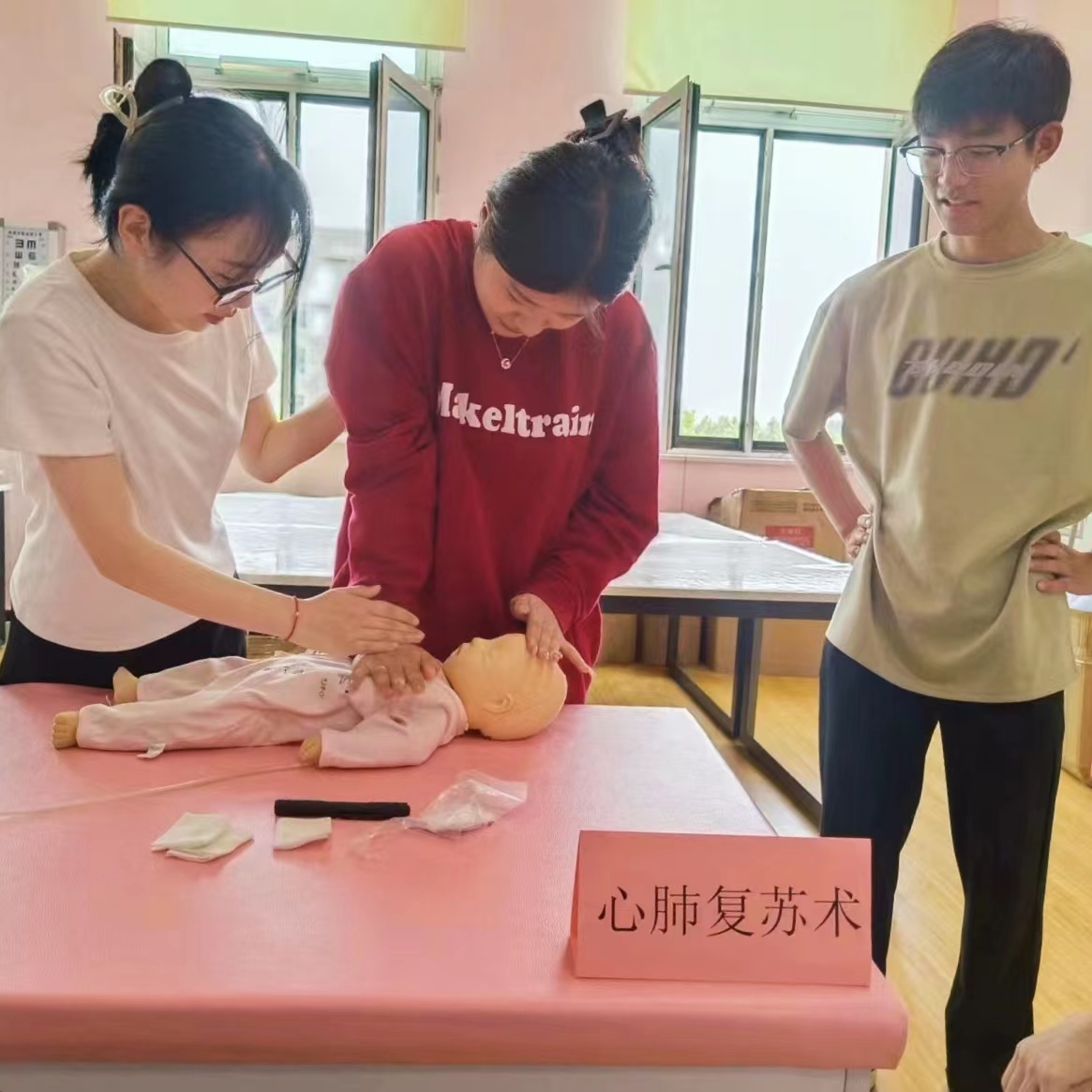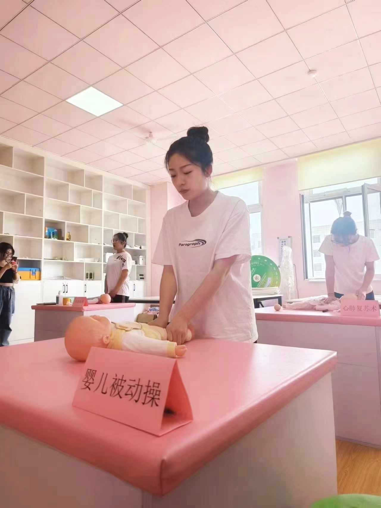 本次活动于2023年5月18日下午在taptap点点知新1号楼236教室(西)——婴幼儿保育实训室举办,诚邀学院老师、22级婴幼儿托育与服务管理专业及其他各专业在校学生参与活动。活动由王乐、杨松涛老师进行实操指导,来自21级婴幼儿托育与服务管理专业的学生张子涵、王伊、赵佳乐、徐子茗、吴英迪、许嘉琪同学为前来学习体验的老师和同学们在操作台上分别展示了更换纸尿裤、婴儿抚触、婴幼儿心肺复苏术、婴儿被动操、婴儿包被、婴幼儿误食处理这六项婴幼儿保健与照护技能。