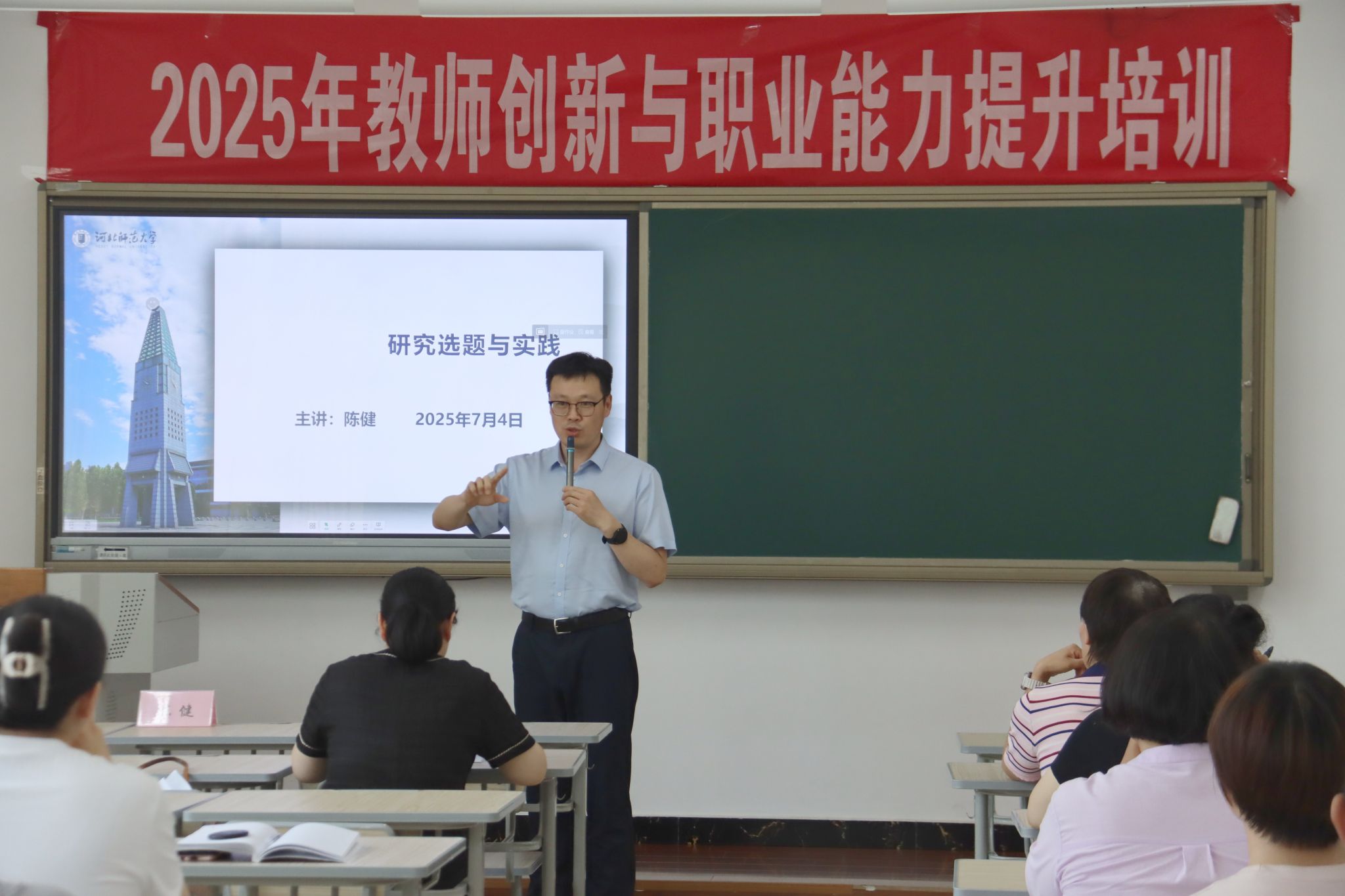 下午,河北师范大学教师教育学院副研究员、硕士生导师陈建以“科研项目选题与实证论文创作”为主题,为教师们开展了一场科研能力提升培训。陈教授从科研项目选题的重要性入手,引导教师们从教学实践、社会热点、学科前沿等方面挖掘有价值的选题。
