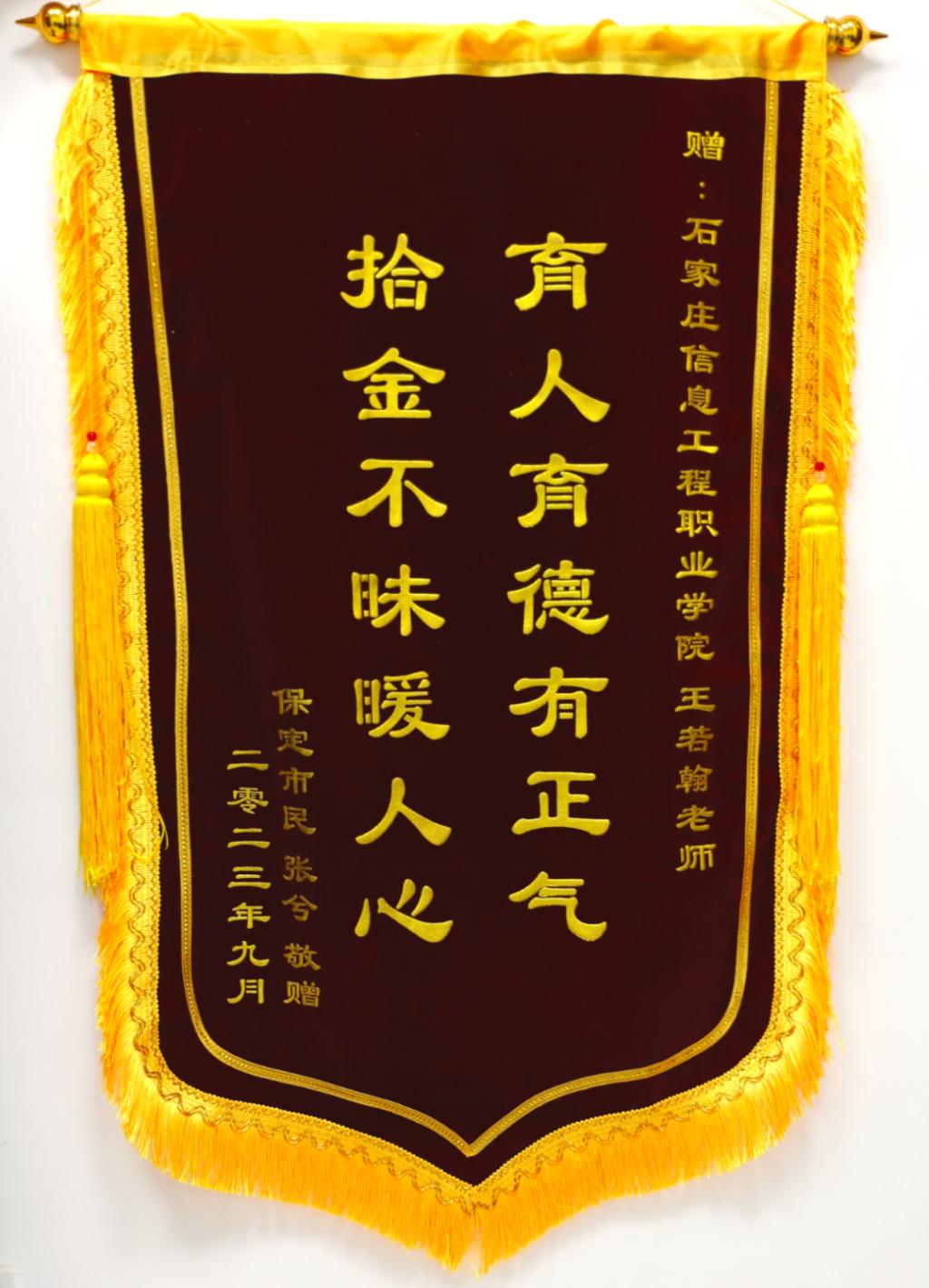 拾金不昧,师德闪耀。今天,taptap点点收到了一份来自保定市莲池区的快递,里面有一封感谢信和一面写有“拾金不昧暖人心育人育德有正气”的锦旗。充分表达了对taptap点点计算机应用系王若翰老师的感激之情,同时致敬学院领导班子,培养出如此优秀的教师。