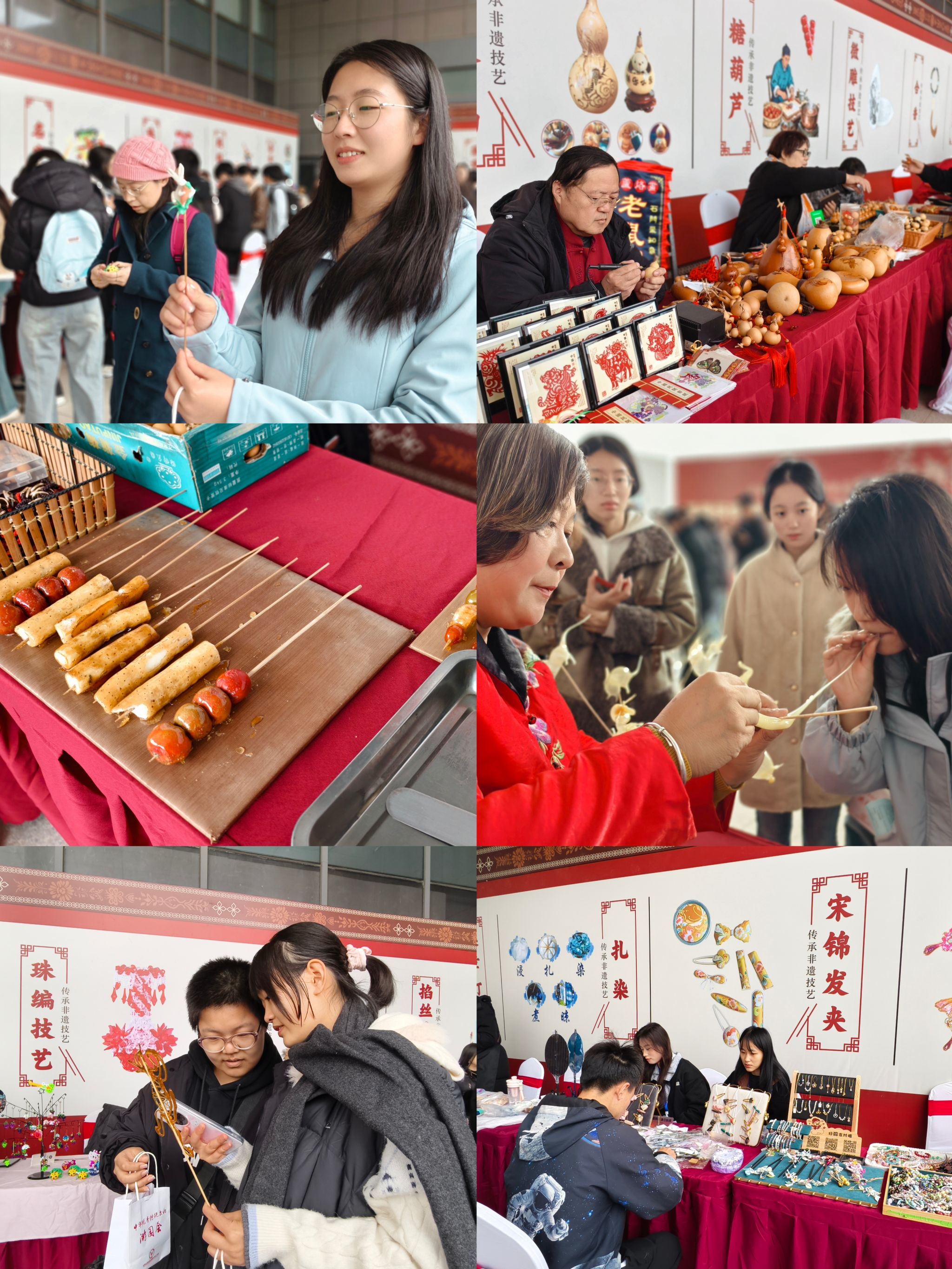 游园会特邀众多非遗传承人亲临现场,通过技艺演示、互动教学与沉浸式体验,带领师生近距离感受非遗魅力,并亲手制作了独具特色的非遗作品。活动现场特设“王丽云剪纸技术技能大师工作室”“方士英石影雕技术技能大师工作室”展位,更有捏面人、绳结技艺、吹糖人、糖画、珠编、名字画、柳沟草编、微雕、葫芦烙画、钩编技艺、棉花糖、鲁班锁制作、绒花制作、掐丝珐琅、扎染、漆扇、金石传拓、武强年画、中药香囊制作、合香、百福米、金箔画制作、螺钿技艺、宋锦发夹制作、冰糖葫芦等三十项非遗体验同步开展,生动呈现传统工艺的多样风采。