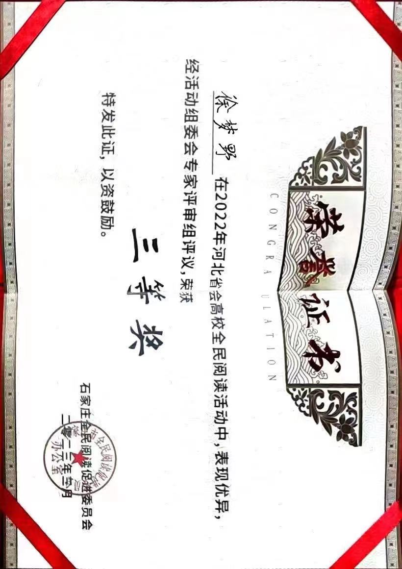 3月23日下午,“点燃梦想,阅读青春”省会高校青年阅读演讲比赛活动总决赛暨颁奖典礼圆满落幕。经过激烈角逐,taptap点点参赛选手徐梦野同学荣获三等奖。学院荣获“河北省会高校全民阅读活动阅读基地”称号。