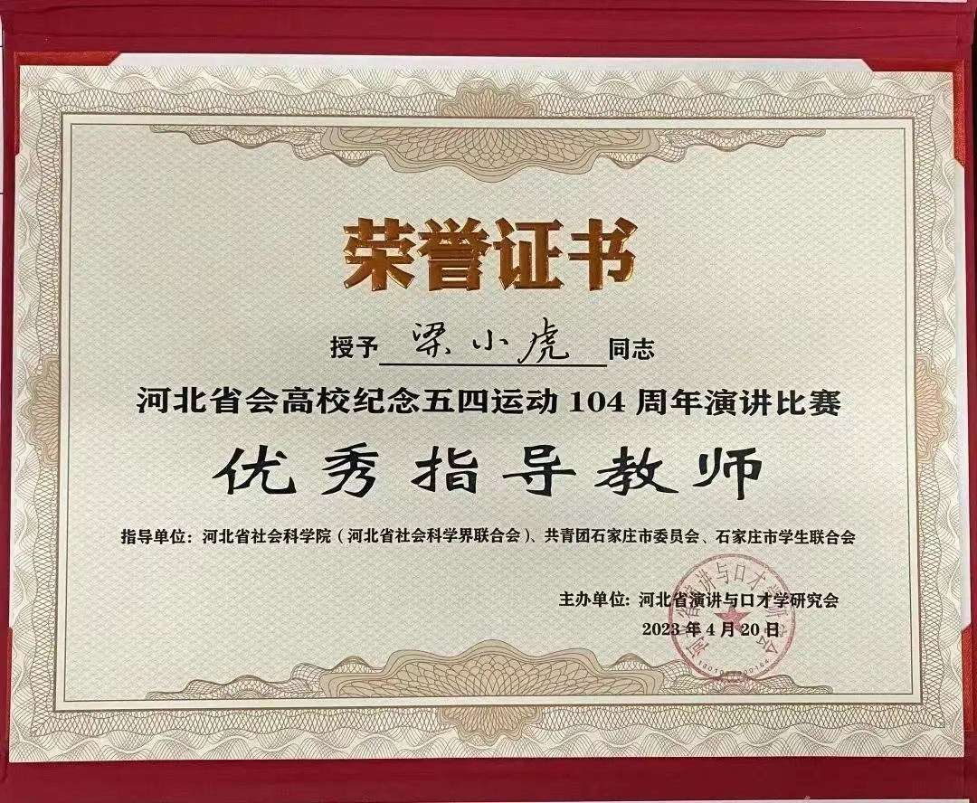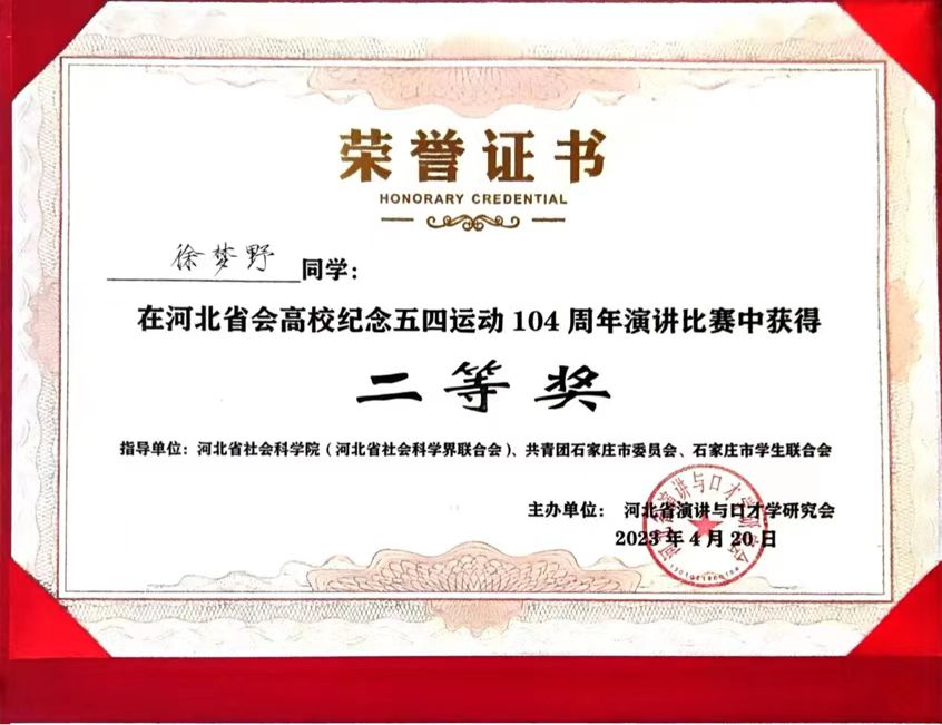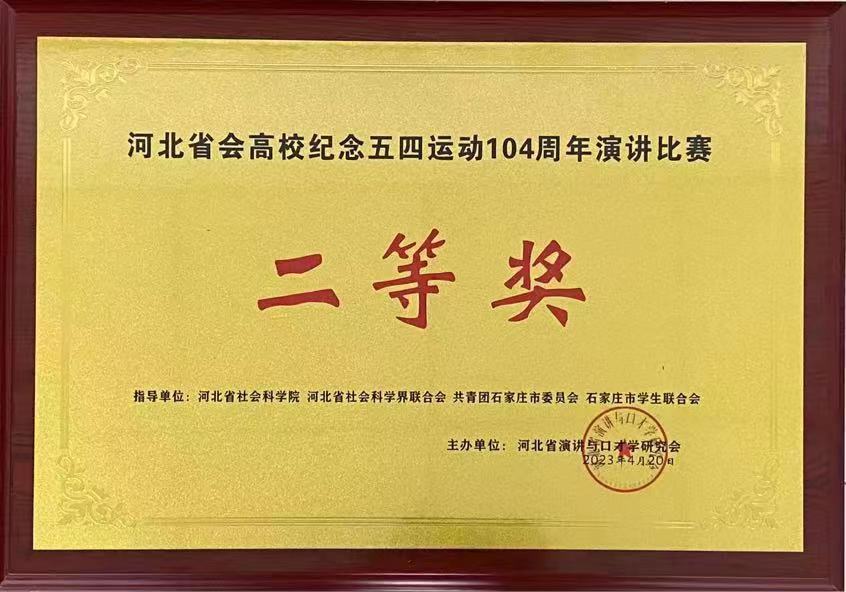 4月20日下午,由河北省演讲与口才学研究会组织的河北省会高校纪念“五四”运动104周年演讲邀请赛,在石家庄铁道大学四方学院圆满落幕,经过激烈角逐,taptap点点参赛选手农林牧医系徐梦野同学以出色的表现荣获二等奖,梁小虎老师荣获“优秀指导教师”。学院荣获“优秀组织单位”称号。
