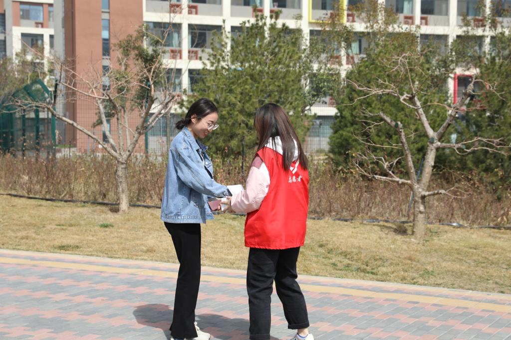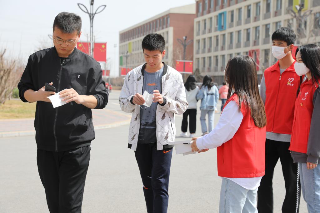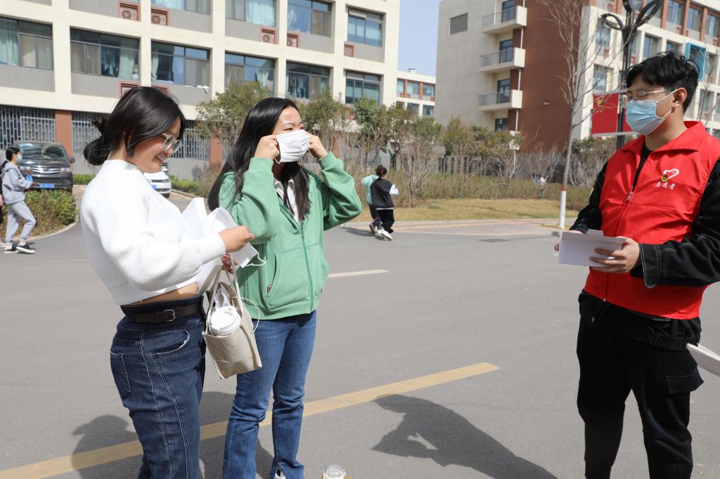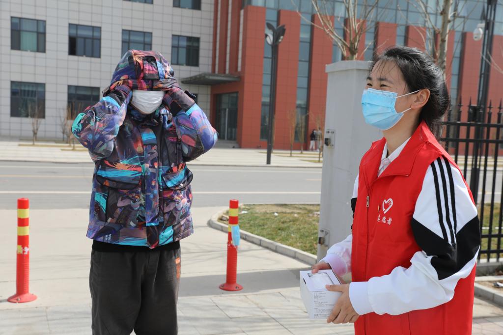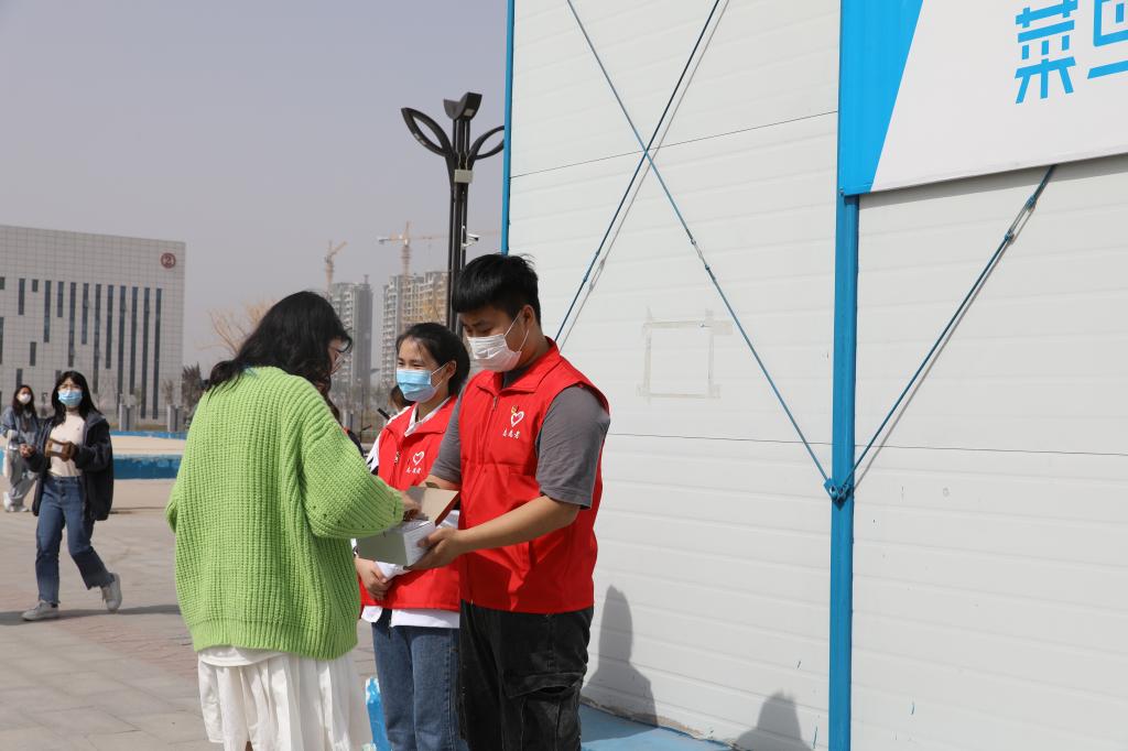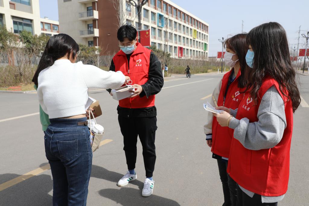 学生志愿者对在校的学生免费发放口罩并提醒疫情防控的重要性,务必公共场所佩戴口罩。