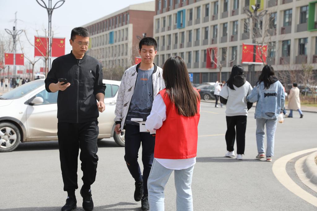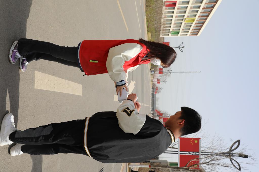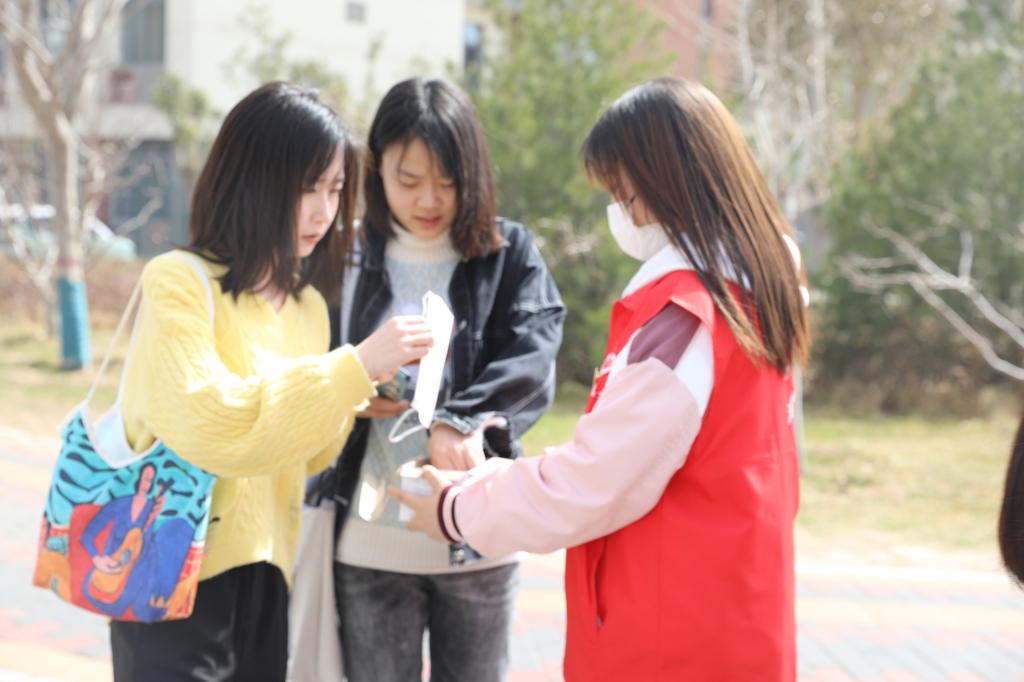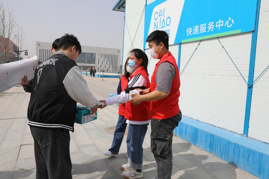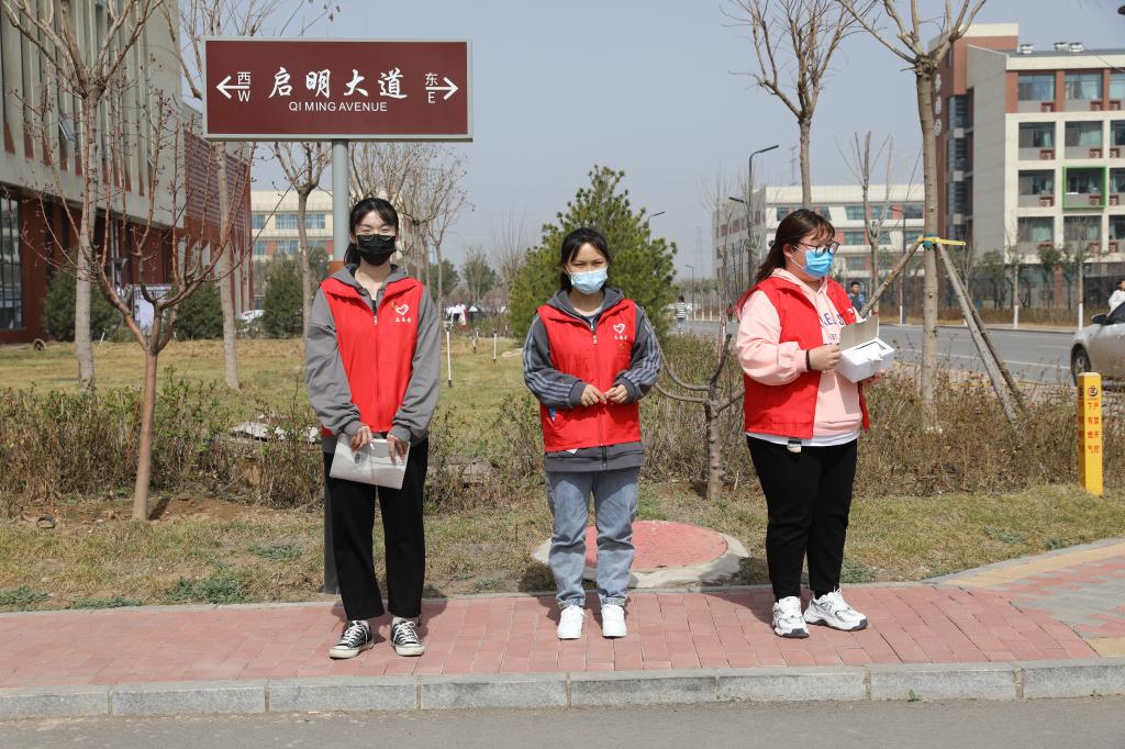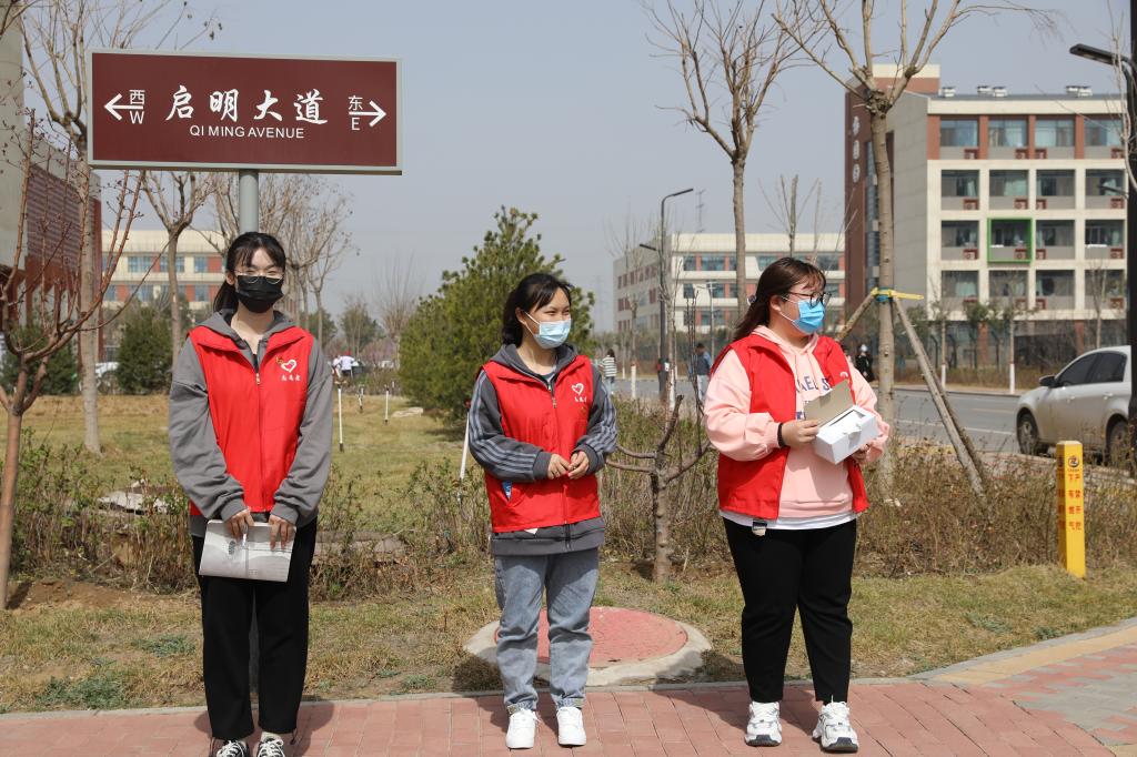 学生志愿者对在校的学生免费发放口罩并提醒疫情防控的重要性,务必公共场所佩戴口罩。