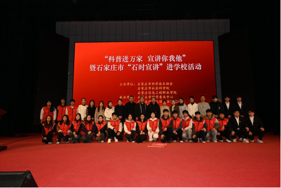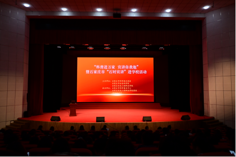 石家庄市科学普及中心信息科科长吴君波,石家庄市社科院(市委讲师团)信息资料室主任陈战彬以及市委讲师团讲师十人到场,学院700余名师生参加活动。