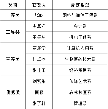 比赛最后评出一等奖1名,二等奖2名,三等奖3名,优秀奖3名。